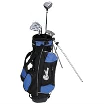 Package includes: Clubs: Driver/fairway wood with extra loft for easy hitting (39") Oversized Ti-Matrix perimeter-weighted irons with large forgiving sweet spot - 7 iron (34") 9 iron (33") White Ball Putter (32") & longneck headcover. Stand Bag: DELUXE junior stand bag with double shoulder strap 4 way divider 4 exterior pockets umbrella holder Velcro glove tab & rain hood. Graphite Shafts- Junior Flex. Soft wrap grips. For Boys & Girls between 8-13 years of age and 4'6" - 5'1" in height. Brand new.[]More detail ...